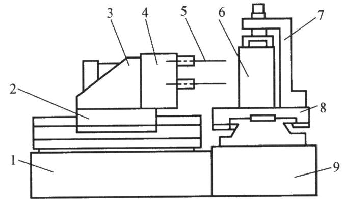 1.床身;2.動力滑臺; 3.動力頭; 4.主軸; 5.刀具; 6.工件; 7.夾具;8.工作臺;9.底座