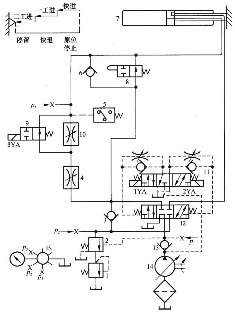 1.背壓閥;2.順序閥;3.單向閥; 4.一次工進調(diào)速閥;5.壓力繼電器; 6.單向閥;7.液壓缸; 8.行程閥;9.電磁閥; 10.二次工進調(diào)速閥;11.先導(dǎo)閥; 12.換向閥;13.單向閥; 14.液壓泵; 15.壓力表開關(guān); p1、p2、p3.壓力表接點