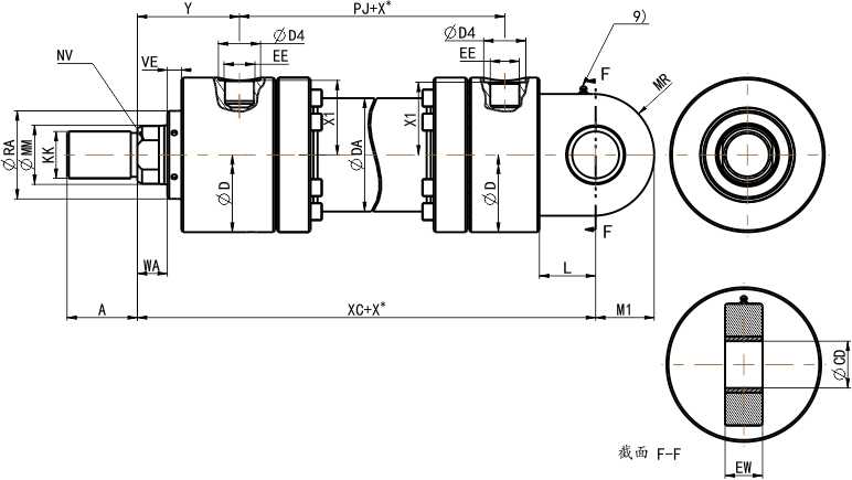 CDH1系列液壓缸后耳環(huán)帶襯套安裝方式。液壓缸的這種安裝方式允許油缸繞銷軸旋轉,但不允許側向擺動。由于此系列液壓缸耐高壓到25MPa,抗疲勞,故常用于冶金行業(yè),水泥行業(yè).故也叫作重載