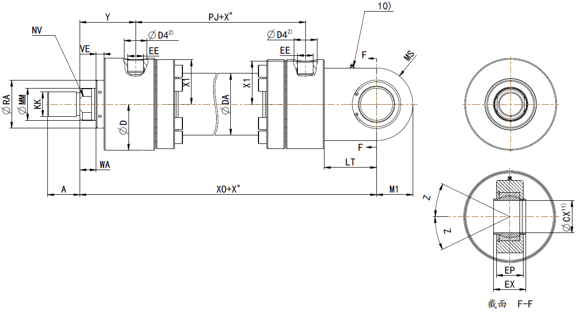 CDH2系列液壓缸后耳環(huán)帶關(guān)節(jié)軸承安裝方式。液壓缸的這種安裝方式允許油缸繞銷軸旋轉(zhuǎn),同時可以在旋轉(zhuǎn)的法向上可以有小角度的擺動。使用更靈活。由于此系列液壓缸耐高壓到25MPa,抗疲勞,