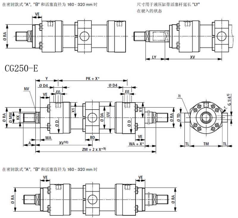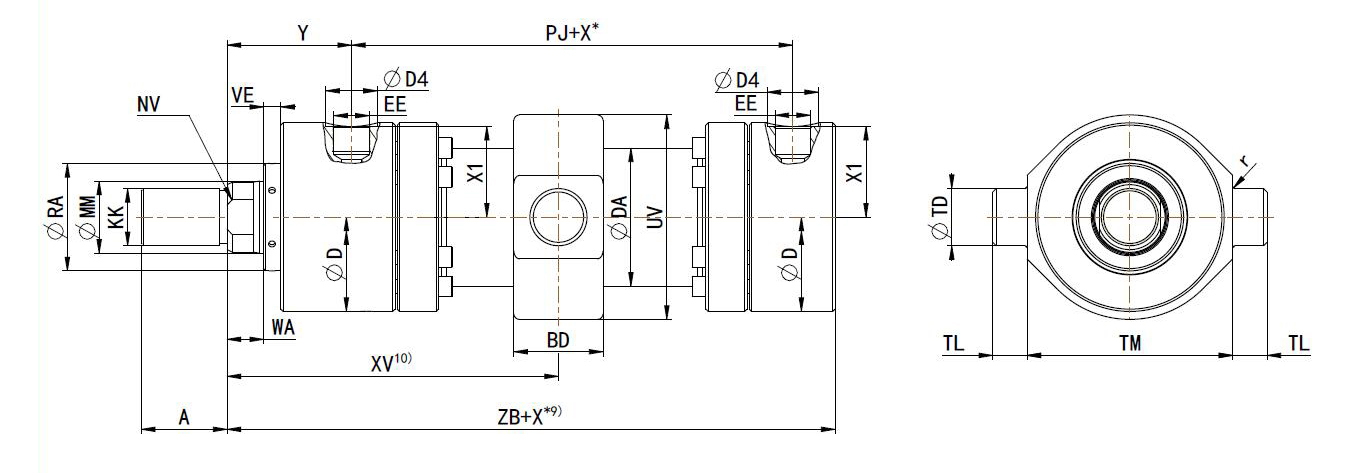 CD250系列高壓油缸中間鉸軸安裝方式。液壓缸的這種安裝方式允許油缸繞鉸軸旋轉(zhuǎn),但不允許側(cè)向擺動(dòng)。此方式可做等速油缸(雙出桿油缸) 。 特別提醒:XV尺寸必須由客戶指定。