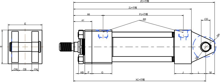 HMI/HMD重載拉桿油缸后雙耳環(huán)安裝方式, 代號(hào):BB 符合:ISO 6020/2 (同派克HMI/HMD油缸,力士樂(lè)CDT3油缸)