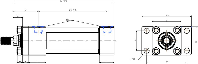HMI/HMD重載拉桿油缸后法蘭安裝方式 代號(hào):HH 符合標(biāo)準(zhǔn):ISO 6020/2 DIN 24554 (同力士樂(lè)CDT3拉桿油缸,派克HMI/HMD拉桿缸)